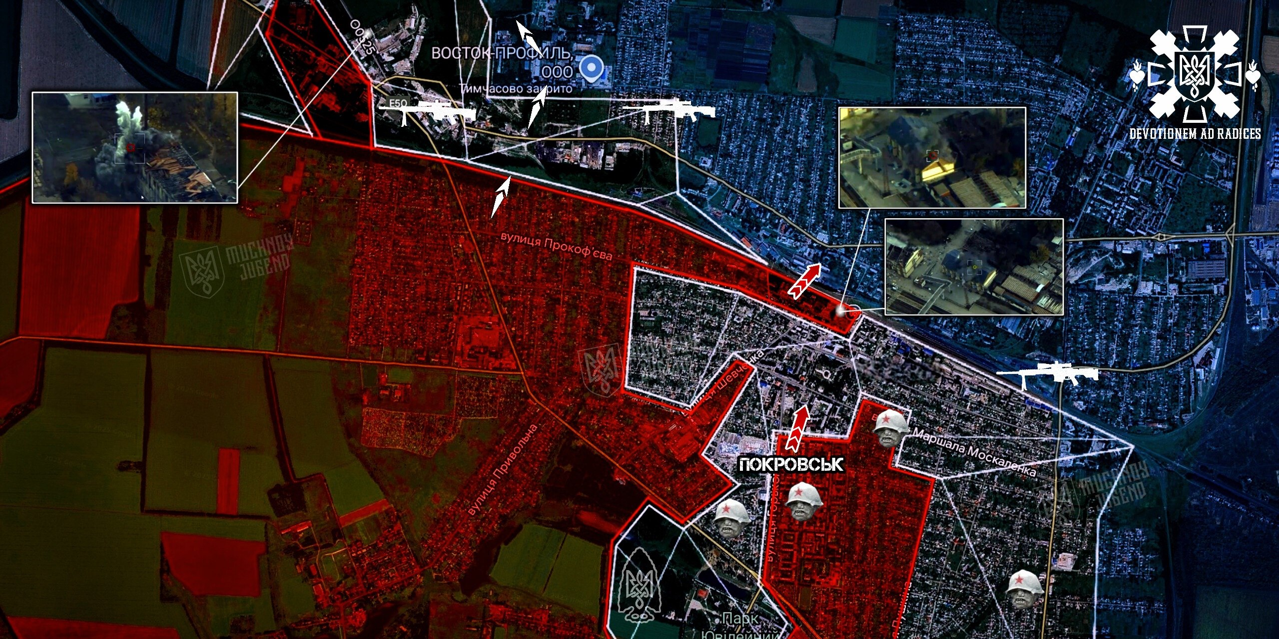Кроме того, отдельные российские паблики сообщают о продвижении к Гришино - населенному пункту к северо-западу от Покровска, через который идет основной маршрут снабжения города. Российское минобороны заявляет о захвате Чунишино юго-восточнее (украинские военные это подтверждают).