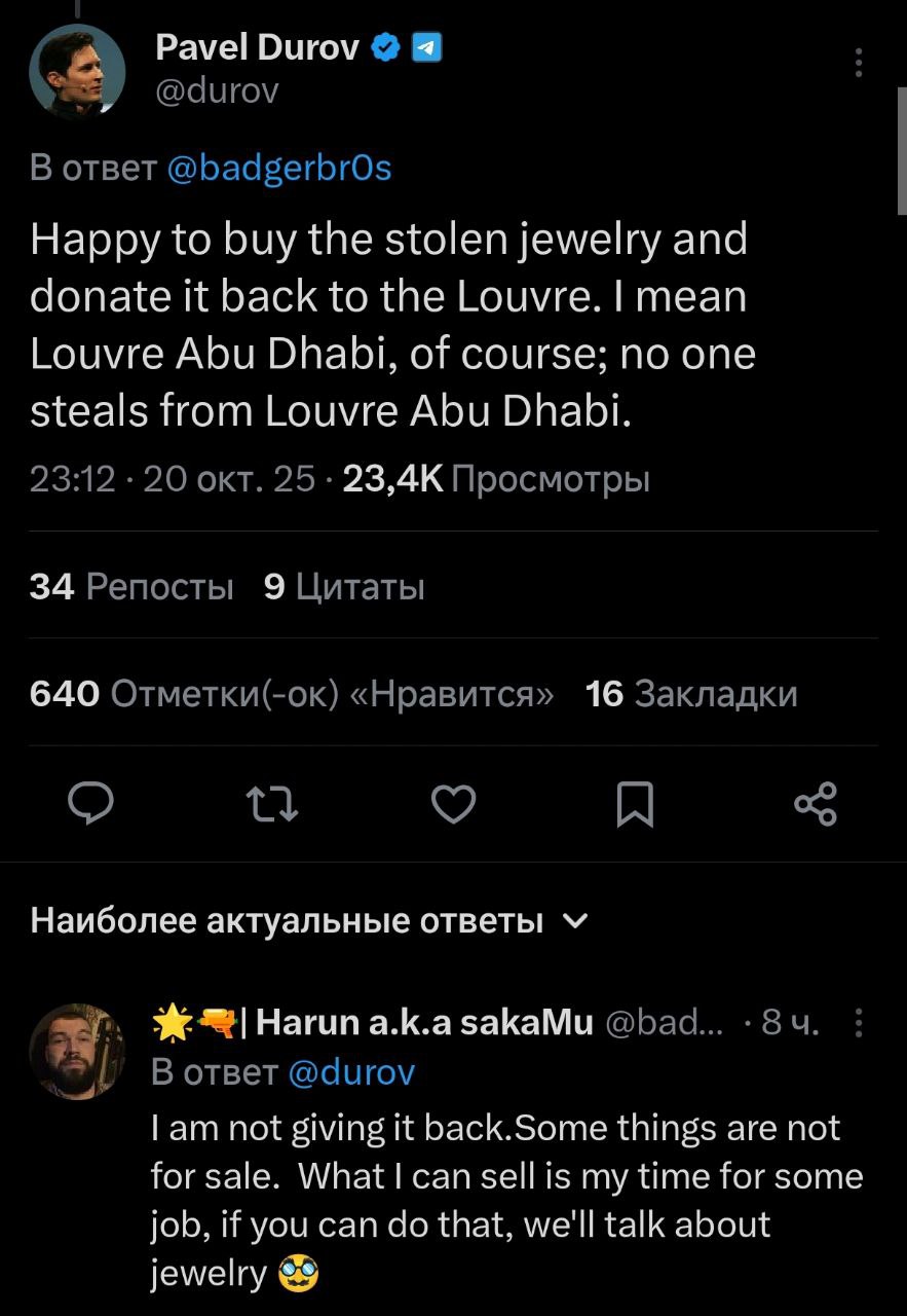 "Рад купить украденные украшения и пожертвовать их обратно Лувру. Я имею в виду, конечно, Лувр в Абу-Даби; никто ведь не крадёт из Лувра в Абу-Даби", - написал Дуров.