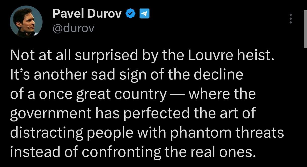 "Меня совершенно не удивило ограбление Лувра. Это ещё один печальный признак упадка некогда великой страны, где правительство довело до совершенства искусство отвлекать людей мнимыми угрозами, вместо того чтобы противостоять реальным", - написал основатель Telegram.