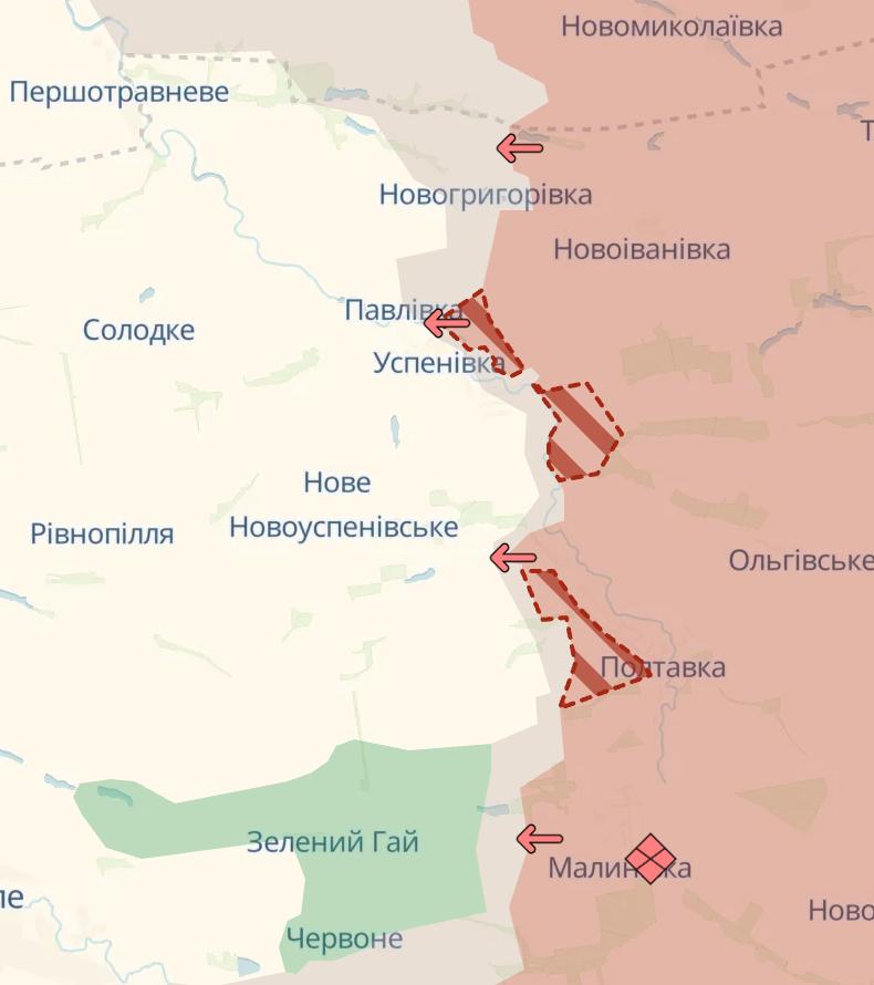 Они захватили Полтавку в Запорожской области (о чем уже ранее заявляли в РФ) и продвинулись севернее около Нововасильевки и Охотничьего, а также зашли в Днепропетроовскую область в районе Ивановки.