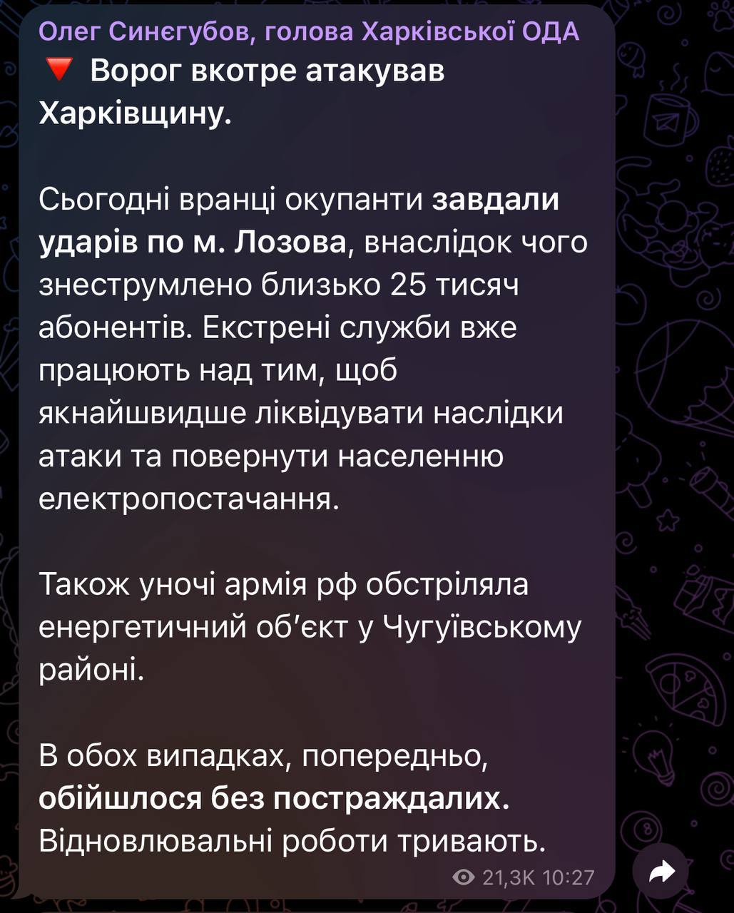 13:27 После утренних ударов по Лозовой в Харьковской области без света находятся около 25 тысяч абонентов, сообщил глава Харьковской ОВА Синегубов.