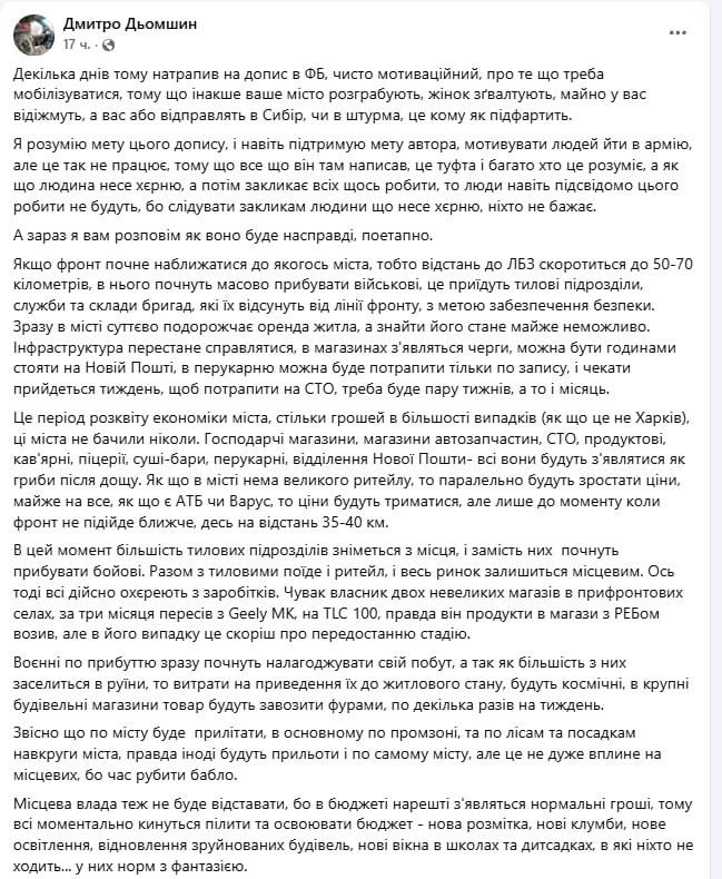 Украинский военный Дмитрий Демшин описал фазы жизни в украинском городе по мере приближения к нему линии фронта.
