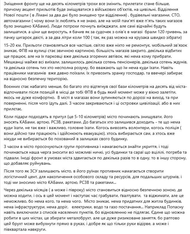 "Город постепенно уничтожается ударами КАБов, РСЗО, ракет и артиллерии. Оставшихся жителей вывозят волонтеры или полиция", - пишет военный.