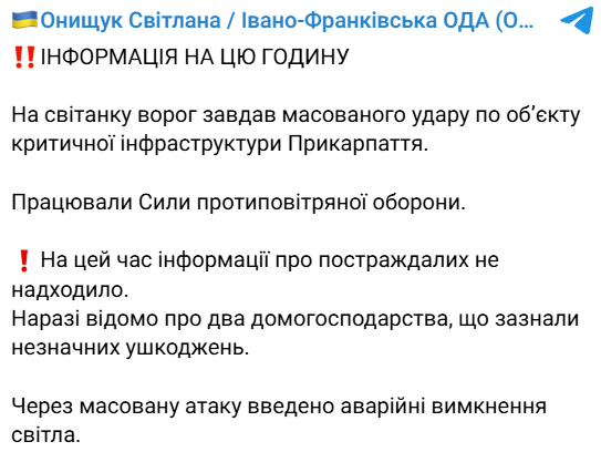 По информации главы Ивано-Франковской ОГА Светланы Онищук, на рассвете был поражён объект критической инфраструктуры.