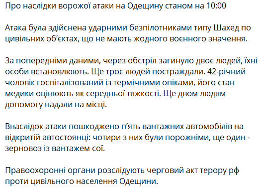 Как сообщил глава Одесской областной военной администрации Олег Кипер, в результате российских ударов по региону погибли два человека, еще трое получили ранения.