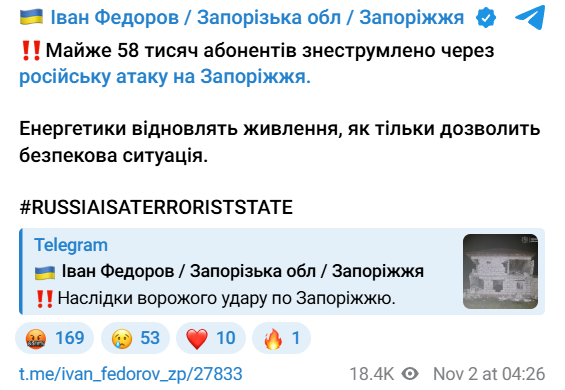 В ночь на 2 ноября Россия нанесла удары по объектам гражданской инфраструктуры в Одесской, Запорожской и Днепропетровской областях.