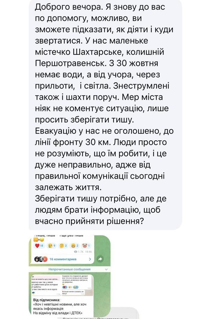 "Эвакуация у нас не объявлена, до линии фронта 30 км. Люди просто не понимают, что им делать", - пишет житель.