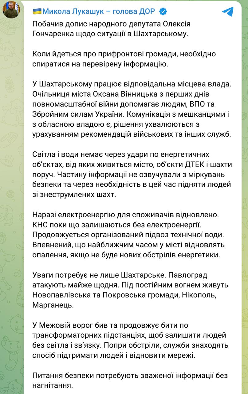 После поста Гончаренко глава днепропетровского облсовета Лукашук подтвердил прилеты по энергетике. Говорит, свет уже дали, надеются вскоре восстановить и отопление.