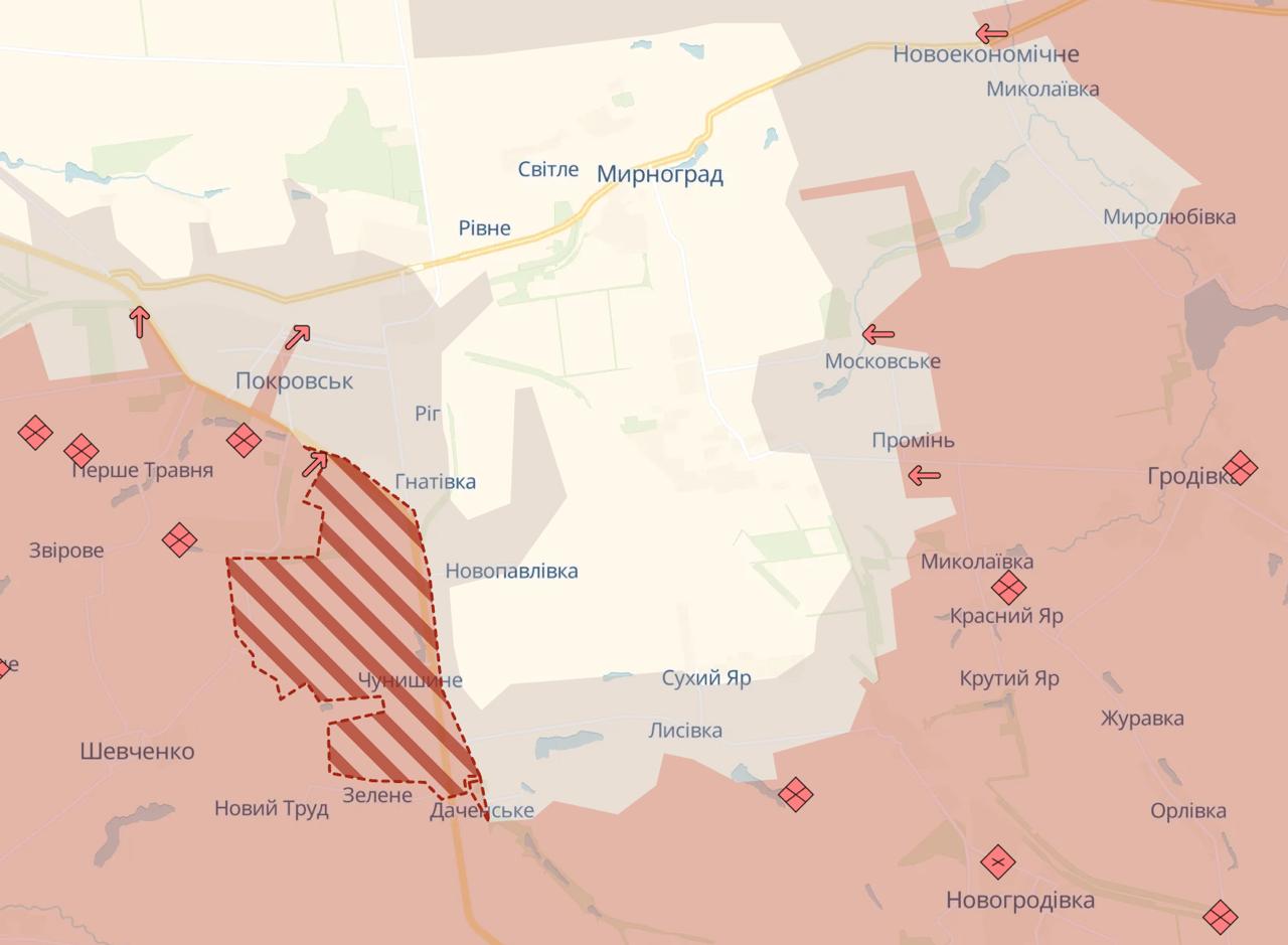 Также россияне продвинулись под Покровском - они масштабно закрпили свои позиции к югу от города. Ранее украинские военные сообщали, что войска РФ заходят в город преимущественно через южные кварталы.
