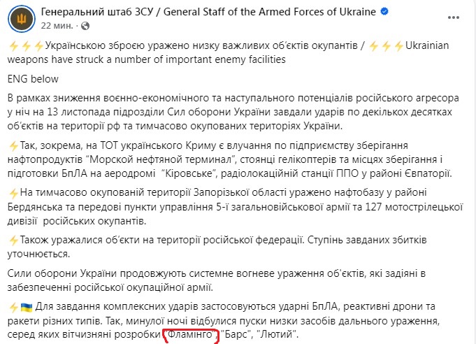 А сегодня Генштаб в своих соцсетях заявил об ударах по десяткам объектов на территории РФ и оккупированных территориях Украины ракетами "Фламинго", дронами "Лютый" и гибридом ракеты и дрона "Барс".