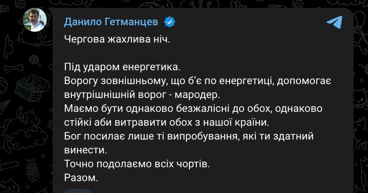 08:47 Основной целью российского удара этой ночью была энергетика, заявил нардеп Даниил Гетманцев.