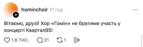 Об отмене участия также объявил хор "Гомин": "Привет, друзья! Хор "Гомин" не будет участвовать в концерте "Квартал-95".