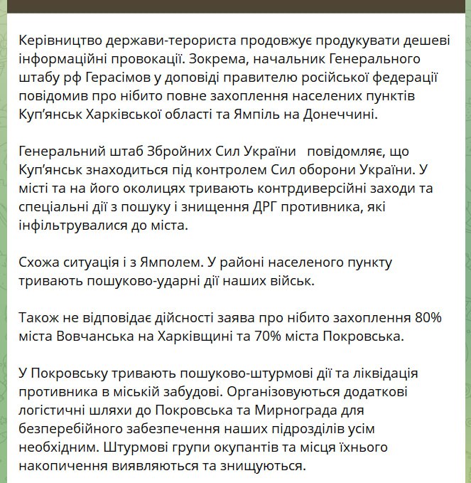 "Генеральный штаб Вооруженных сил Украины сообщает, что Купянск находится под контролем Сил обороны Украины. В городе и в его окрестностях продолжаются контрдиверсионные мероприятия и специальные действия по поиску и уничтожению ДРГ противника, которые инфильтрировались в город. Похожая ситуация и с Ямполем. В районе населённого пункта продолжаются поисково-ударные действия наших войск", – говорится в заявлении.