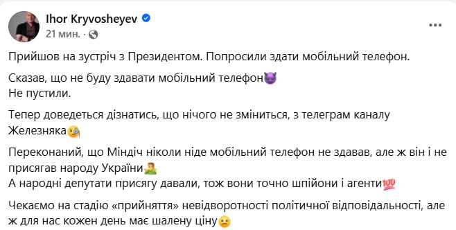 В то же время депутат от "Слуги народа" Игорь Кривошеев отказался заходить на встречу с Зеленским без телефона.