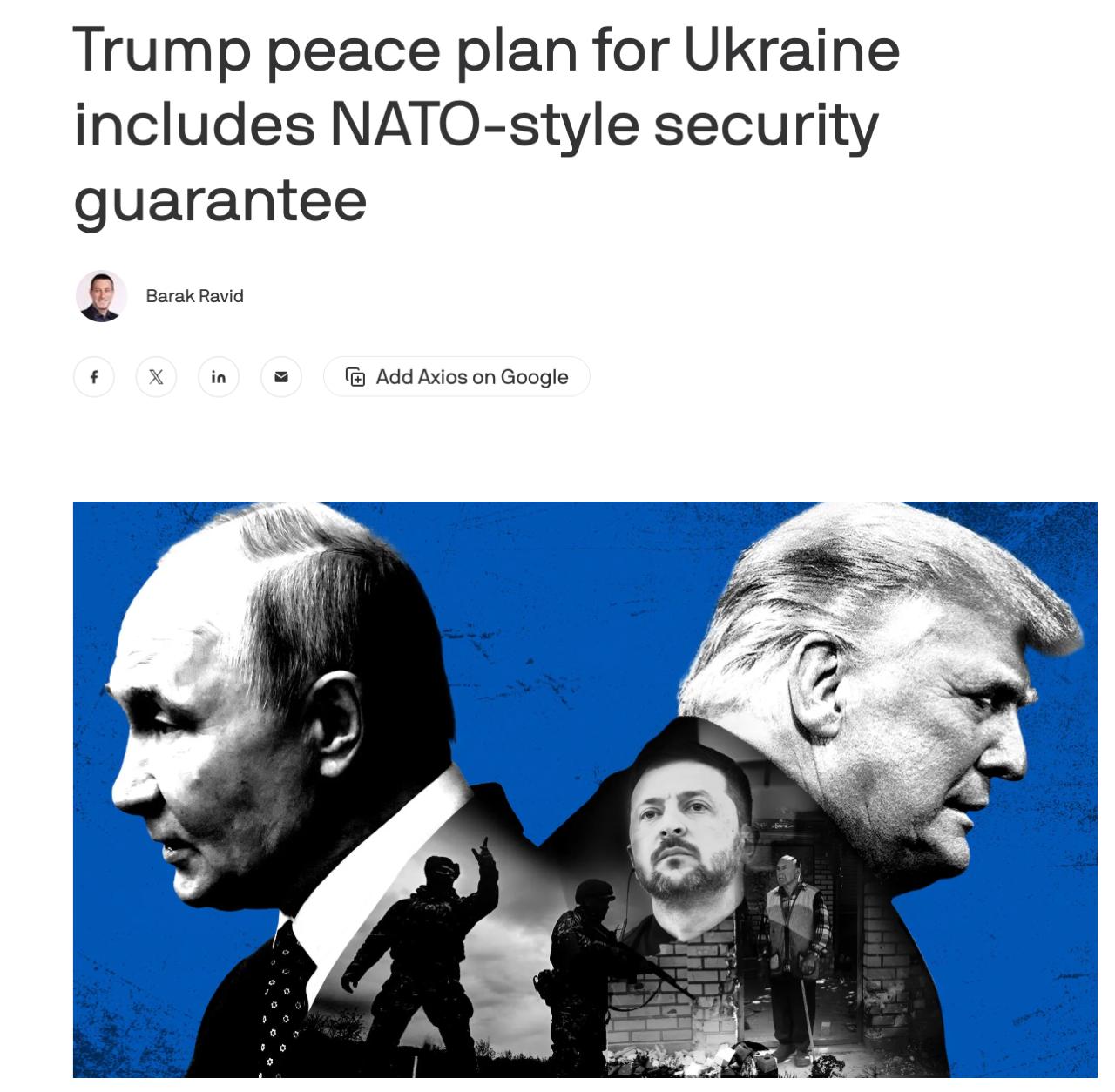 А издание Axios рассказало, что мирный план включает гарантии безопасности, основанные на статье 5 договора о НАТО.