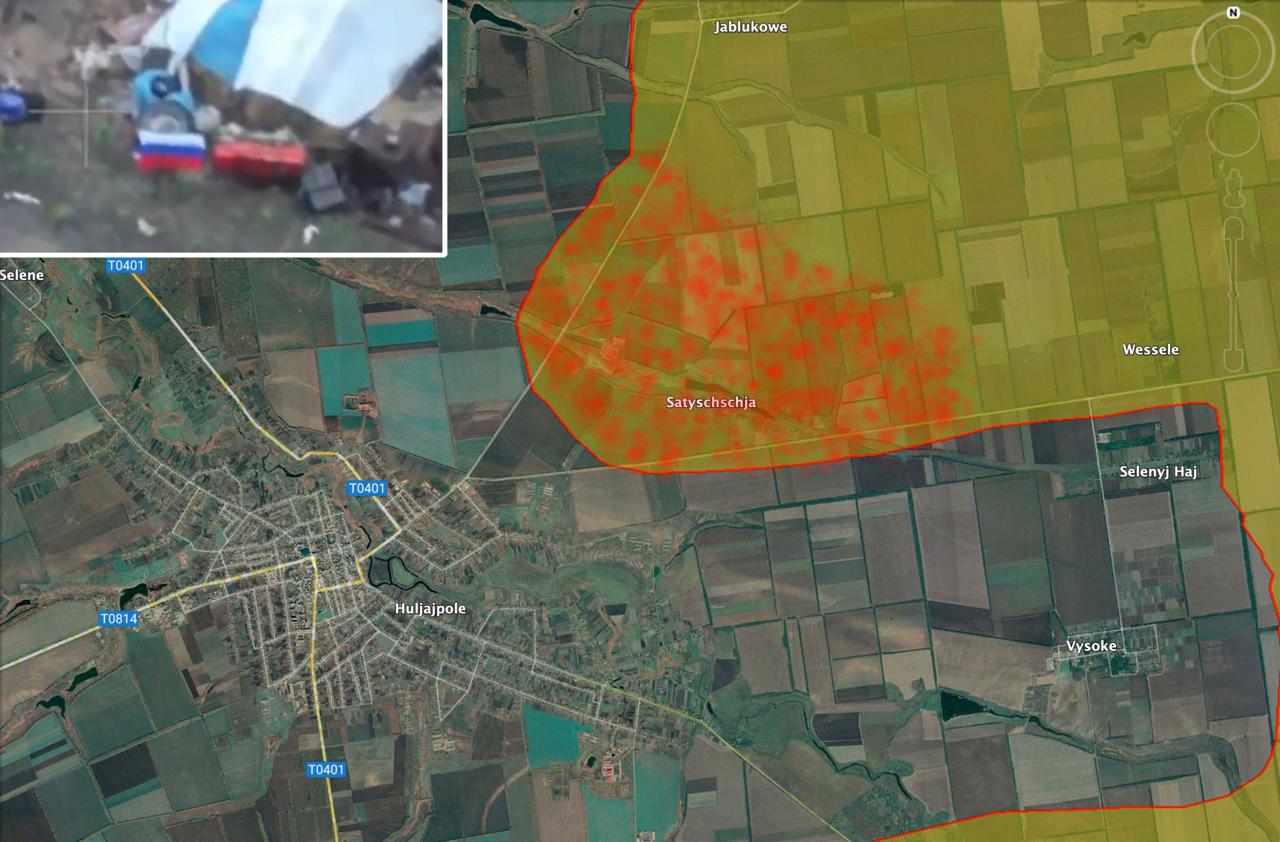 Также российские войска продвинулись в сторону Гуляйполя - в районе Затишья, сообщил Deep State. Немецкий военный обозреватель Юлиан Рёпке подтверждает заявления россиян о захвате села, которое находится на подступах к Гуляйполю (российские паблики пишут, что уже начались бои и в самом городе, но подтверждений этой информации пока нет).