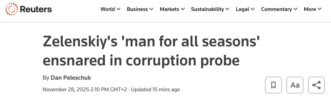 "Если Ермака вынудят уйти в отставку, это можно будет расценивать как обязательство навести порядок, но также и как признак того, что обвинения в коррупции подбираются все ближе к самому президенту. Обеспокоенность американских чиновников обвинениями во взяточничестве, из-за которых уже лишились должностей два министра, подорвала позиции Зеленского в тот момент, когда он больше всего нуждается в их доверии. Украина находится под давлением США, которые требуют принять мирные предложения. Коррупционный скандал также возник в тот момент, когда Украина пытается показать Европейскому Союзу, что она борется с коррупцией, что является ключевой задачей для нее на пути к вступлению в этот блок", - говорится в статье.