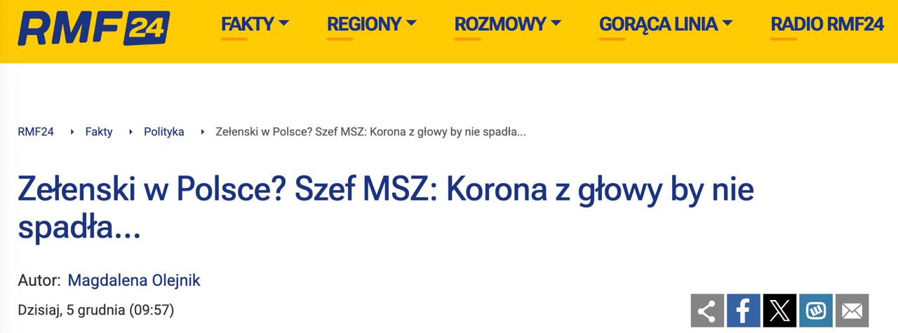 "Назойливые требования извинений и почестей в ситуации, когда они (украинцы - Ред.) борются за жизнь, вызывают у меня отвращение, но с другой стороны, корона с головы Зеленского не упала бы, если бы, проезжая через Польшу, он попросил о визите в президентский дворец" , – сказал Сикорский в эфире RMF FM.