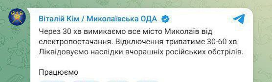 11:51 В Николаеве на час полностью отключат свет, заявил губернатор Ким.