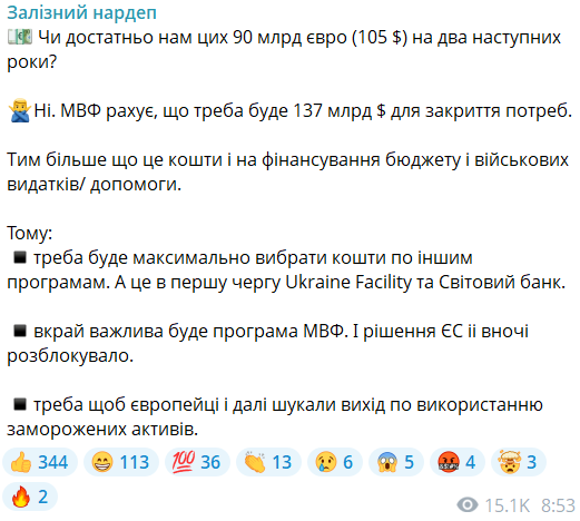 "МВФ считает, что нужно будет 137 миллиардов долларов для закрытия потребностей. Тем более что это средства и для финансирования бюджета, и военных расходов, пособий. Поэтому необходимо максимально получить средства по другим программам. А это, в первую очередь, Ukraine Facility и Всемирный банк. Крайне важна будет программа МВФ. И решение ЕС её ночью разблокировало. Нужно, чтобы европейцы и дальше искали выход по использованию замороженных (российских) активов", - написал Железняк.