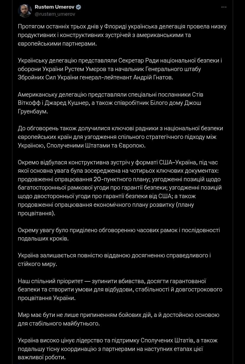 В свою очередь секретарь СНБО Рустем Умеров разместил в соцсетях тот же текст об итогах переговоров, что и Уиткофф.