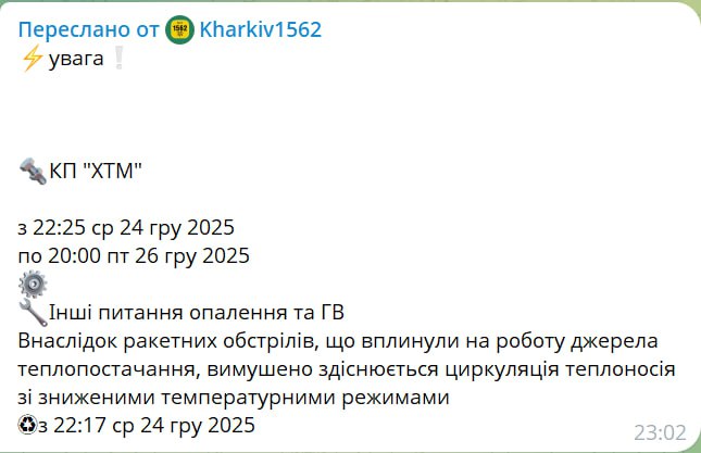 23.11 В Харькове после обстрела ТЭЦ в ряде домов на Холодной Горе отключили отопление и горячую воду минимум до пятницы, сообщают местные жители.