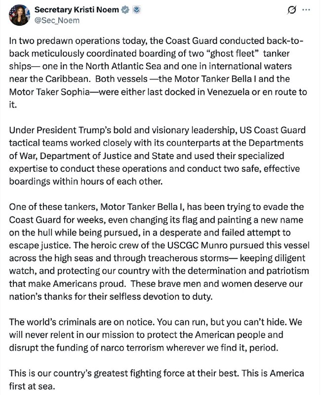 "В ходе операции, проведенной сегодня утром на рассвете, Министерство обороны в координации с Министерством внутренней безопасности без происшествий задержало танкер теневого флота, находившийся под санкциями и не имевший гражданства. Задержанное судно, танкер Sophia, действовало в международных водах и осуществляло незаконную деятельность в Карибском море. Береговая охрана США сопровождает танкер Sophia в США для окончательного решения вопроса. В рамках операции "Южное копье" Министерство обороны неуклонно следует своей миссии по пресечению незаконной деятельности в Западном полушарии. Мы будем защищать нашу родину и восстанавливать безопасность и силу на всей территории Америки", - сказано в публикации командования в Х.