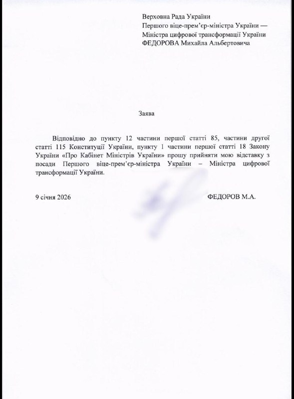 Министр обороны Украины Денис Шмыгаль и первый вице-премьер-министр и министр цифровой трансформации Михаил Фёдоров подали в Верховную Раду заявления об отставке.