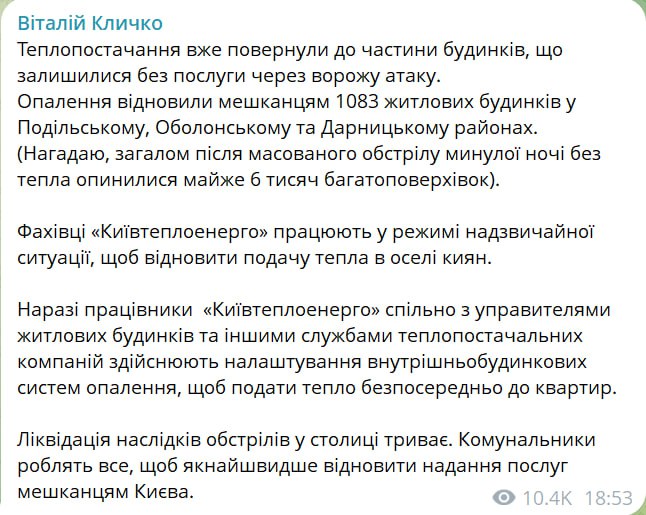Мэр столицы также сообщил, что отопление восстановлено в 1083 жилых домах в Подольском, Оболонском и Дарницком районах.