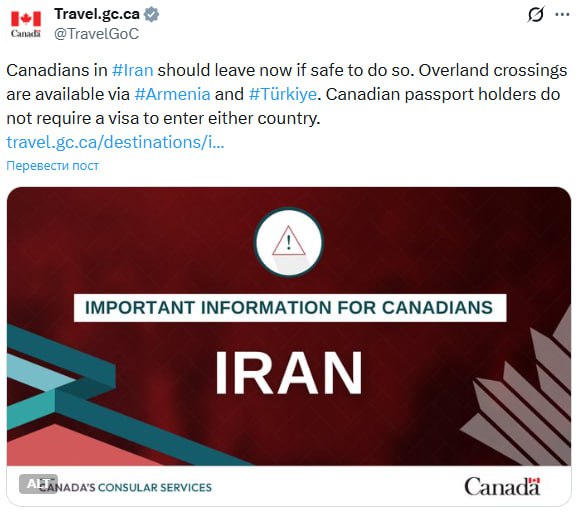 Тем временем Канада призывает своих граждан срочно покинуть Иран.