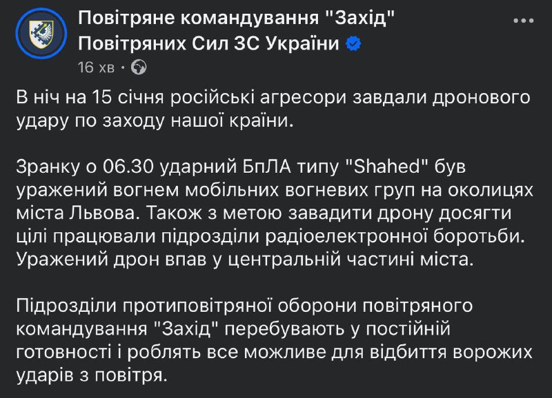 11:04 РФ не пыталась атаковать памятник Бандере во Львове, следует из сообщения Воздушных сил ВСУ. Они сообщают, что в 6:30 утра "Герань" была поражена ПВО на подлете ко Львову и уже подбитая упала в центральной части города около памятника.