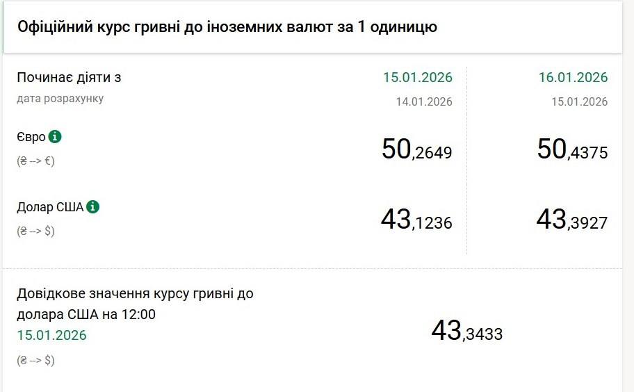 Сегодня, 15 января, Национальный банк Украины снова опустил гривну и установил новые максимумы по официальному курсу на 16 января: по доллару он достиг 43,3927 грн/$ (плюс 27 копеек ко вчерашнему уровню), а по евро - 50,4375 грн/€ (+ 17 копеек).