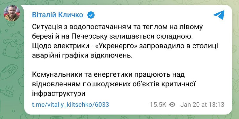 13.25 Ситуация с водоснабжением и теплом на левом берегу Киева и Печерске остается сложной, заявил мэр Кличко.
