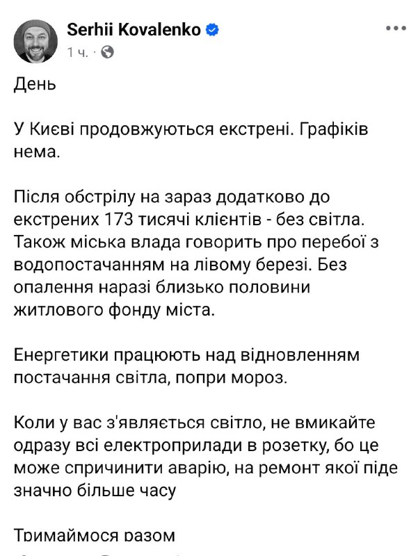 - в Киеве без отопления остались более 5600 многоквартирных домов - столько же, сколько после предыдущего российского удара. Почти вся левобережная часть города без воды, на правом берегу ее нет в отдельных районах. Также продолжаются отключения света.