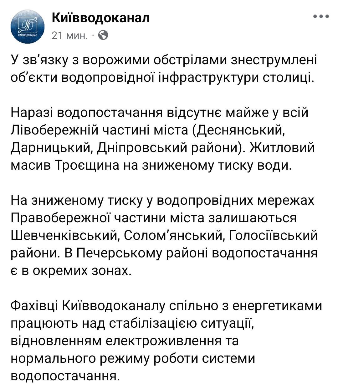 9.09 После обстрела в Киеве без водоснабжения остались Деснянский, Дарницкий и Днепровский районы, сообщили в горводоканале.