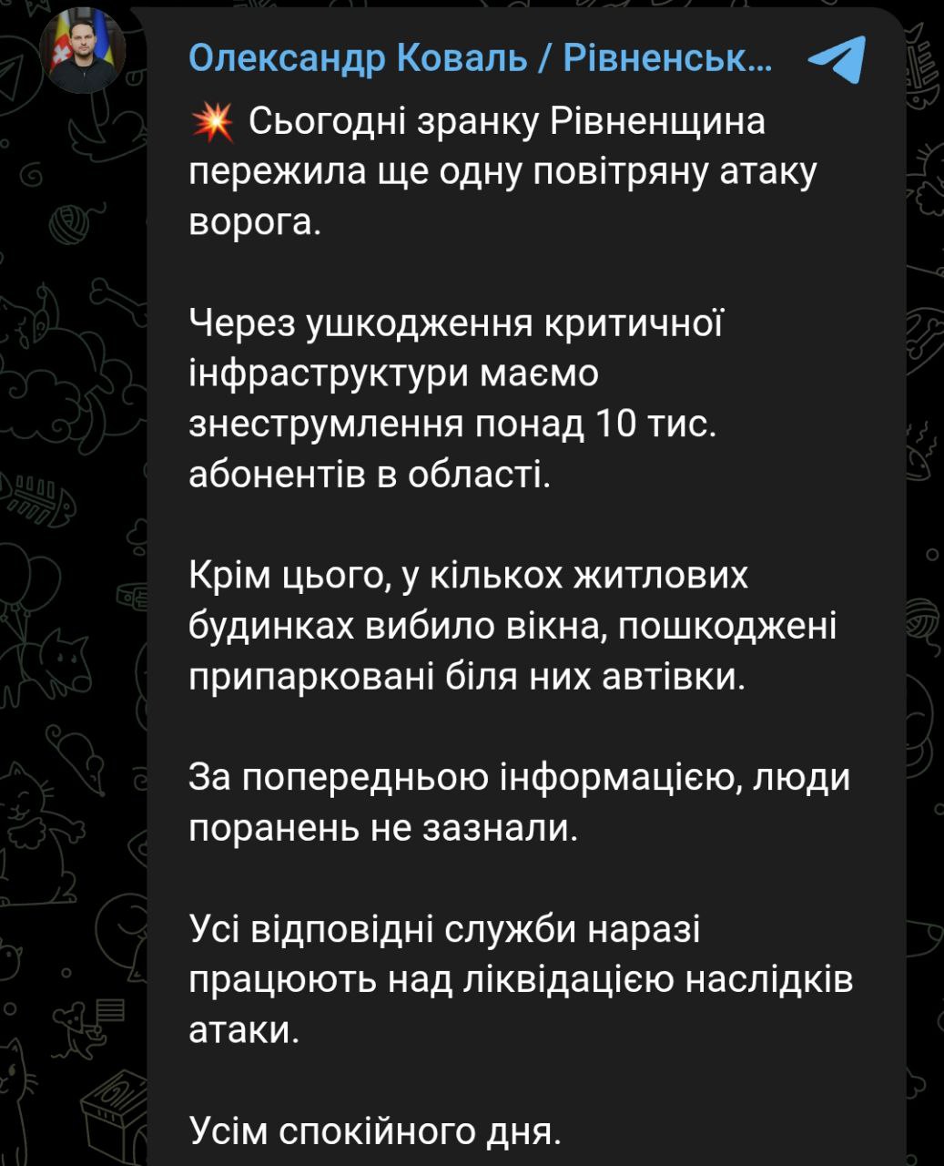 - в Ровенской области после повреждения объекта критической инфраструктуры без света остались более 10 тысяч человек.