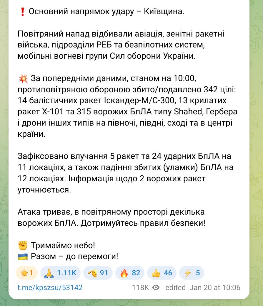 "Зафиксировано попадание 5 ракет и 24 ударных БпЛА на 11 локациях, а также падение сбитых (обломки) БПЛА на 12 локациях. Информация о двух вражеских ракетах уточняется", - сообщают ВС.
