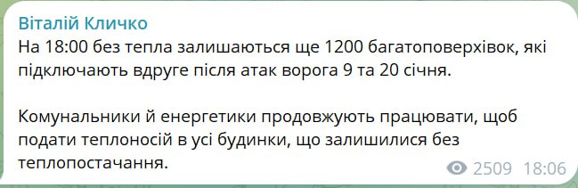 18:11 На 18:00 без тепла в Киеве остаются еще 1200 многоэтажек (из 11 тысяч), которые подключают второй раз после атак 9 и 20 января, сообщил мэр Кличко.
