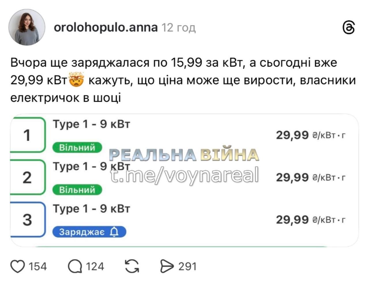 "Открываю сегодня приложение, чтобы посмотреть, где есть зарядка, и вижу, что вместо тарифа 15 гривен за киловатт, по которому я заряжалась буквально вчера на той же самой зарядке, тариф уже 30 гривен. И обещают, что к концу недели он будет 50. Надеюсь, что это неправда", - написала молодая женщина по имени Анна.