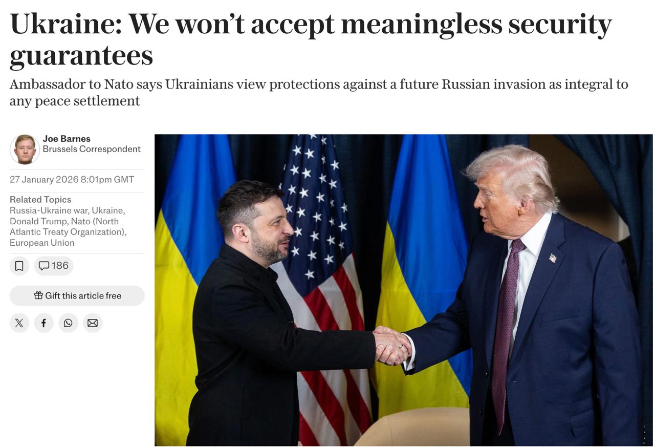 На фоне переговоров в Абу-Даби в европейских СМИ поднимается волна критики против посреднических усилий президента США Дональда Трампа, который, по информации ряда медиа, требует от Украины согласиться на мирное соглашение с РФ (которое, возможно, будет включать вывод украинских войск из Донбасса) в обмен на американские гарантии безопасности.