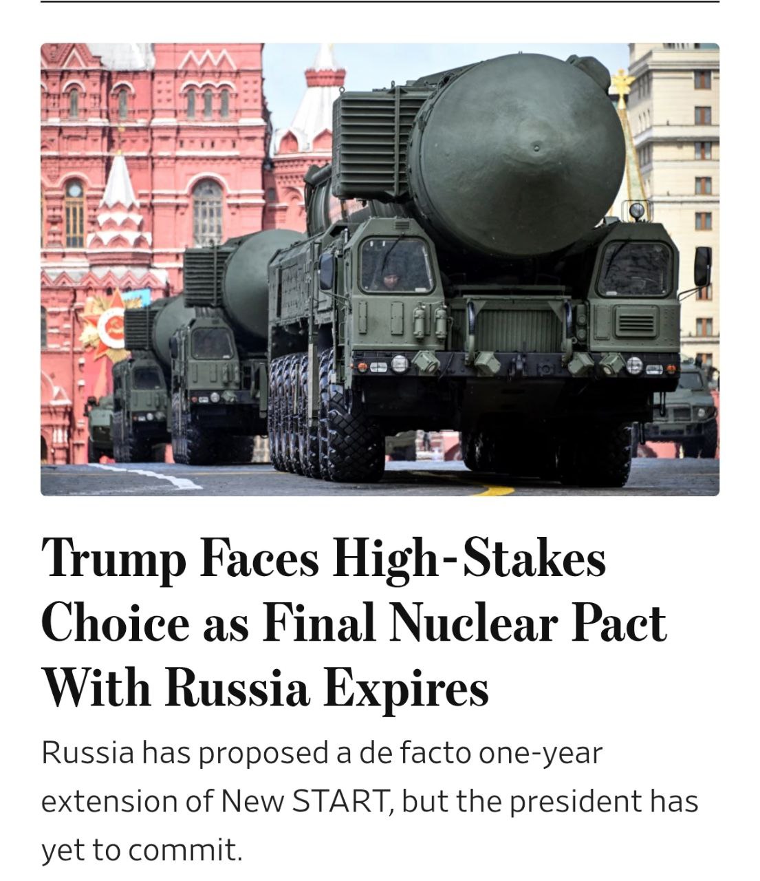 Издание напоминает, что срок действия договора об ограничении стратегических вооружений истекает 5 февраля, и пока Белый дом не дал ответа на предложение России о его продлении на год.