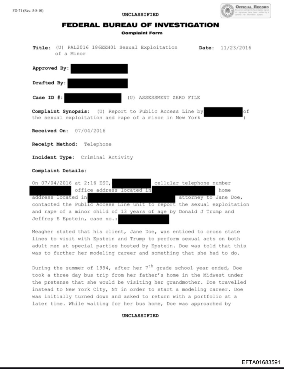 Изложенные в документе претензии к Трампу поступили в ФБР в 2016 году. Их прислал адвокат женщины, обозначенной как Джейн Доу.
