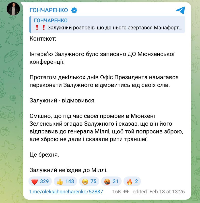 "Смешно, что во время своей речи в Мюнхене Зеленский вспомнил Залужного и сказал, что он отправил его к генералу Милли (генерал армии США в отставке, бывший председатель Объединённого комитета начальников штабов - Ред.), чтобы тот попросил оружие, но оружие не дали и сказали рыть траншеи. Это ложь. Залужный не ездил к Милли", - написал депутат.