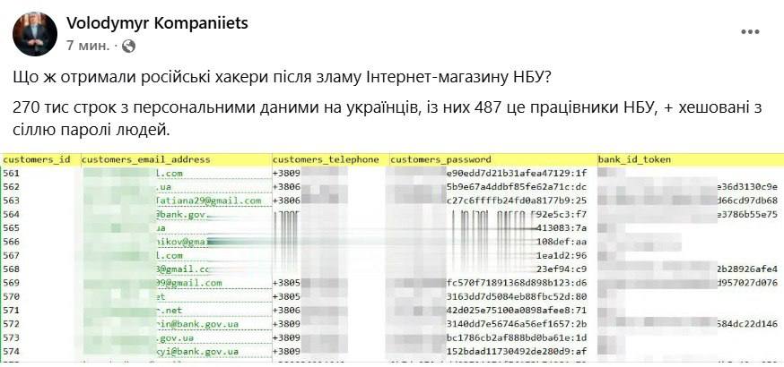 "270 тысяч строк с персональными данными украинцев, из них 487 - это работники НБУ, плюс хешированные с солью пароли людей", - написал эксперт.