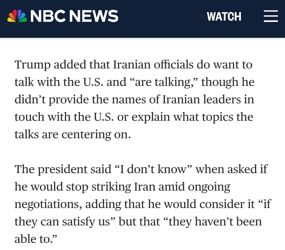 Отвечая на вопрос телеканала NBC News о том, прекратит ли он удары в случае новых переговоров, президент заявил: "Я не знаю".