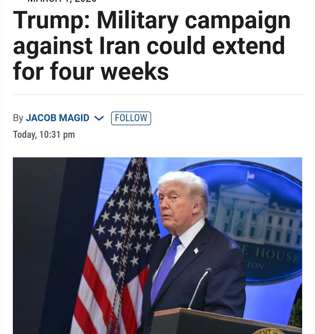 В то же время в интервью газете Daily Mail Трамп заявил, что кампания США против Ирана может продлиться до четырех недель.