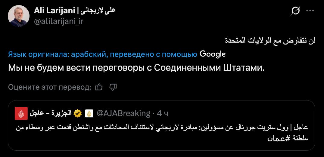 Он перепостил сообщение Wall Street Journal о том, что Лариджани передал США предложение о переговорах через Оман.