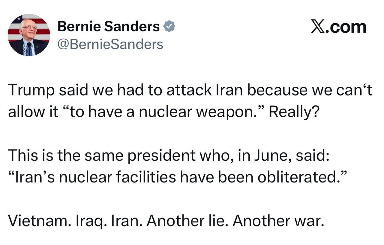 "Трамп заявил, что мы должны атаковать Иран, потому что не можем позволить ему "обладать ядерным оружием". Серьезно? Это тот самый президент, который в июне заявил: "Иранские ядерные объекты уничтожены". Вьетнам. Ирак. Иран. Очередная ложь. Очередная война", - написал Сандерс.