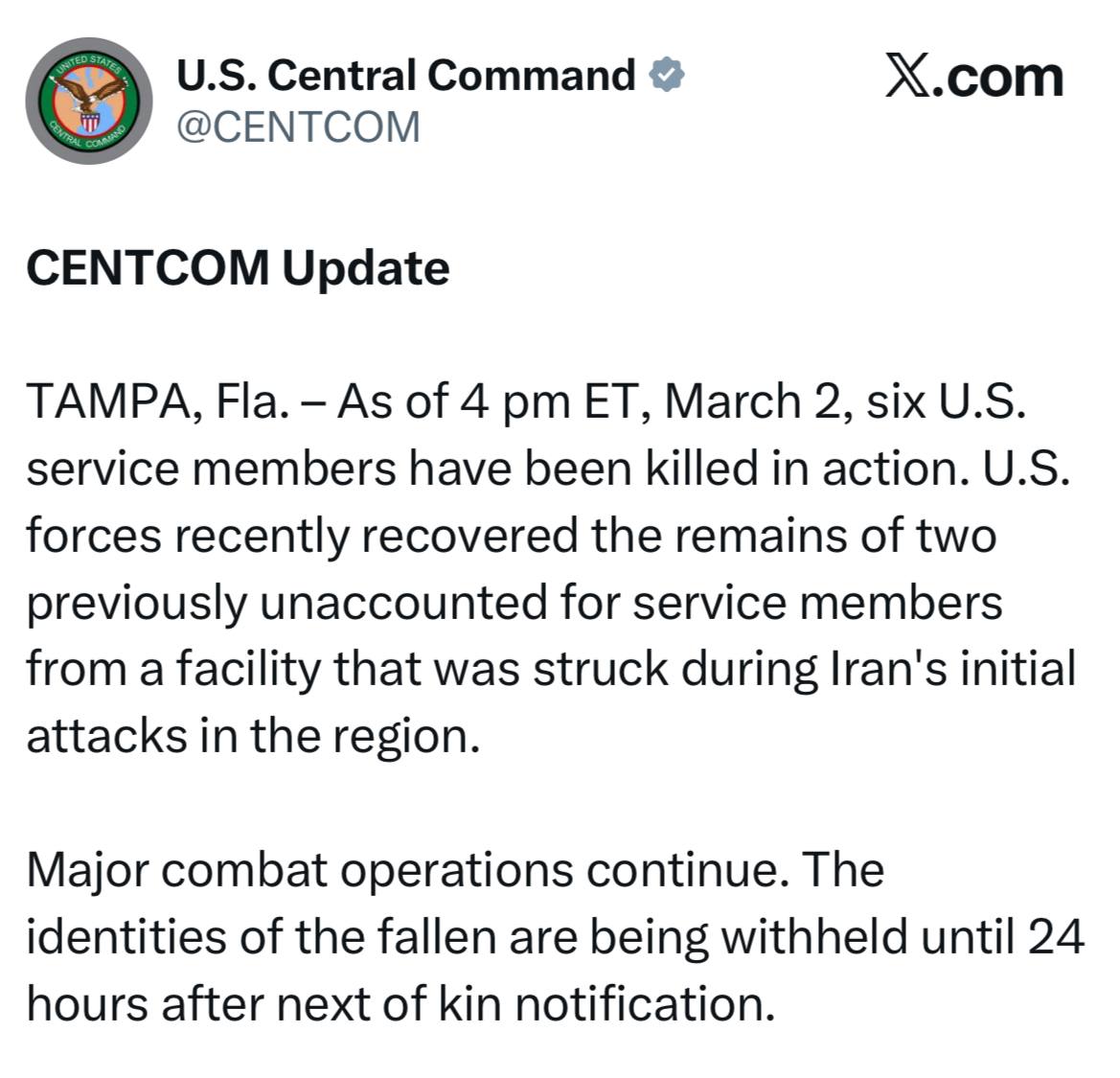 Тем временем Центральное командование Вооруженных сил США сообщает, что число американских военнослужащих, погибших от ударов Ирана, выросло до шести.