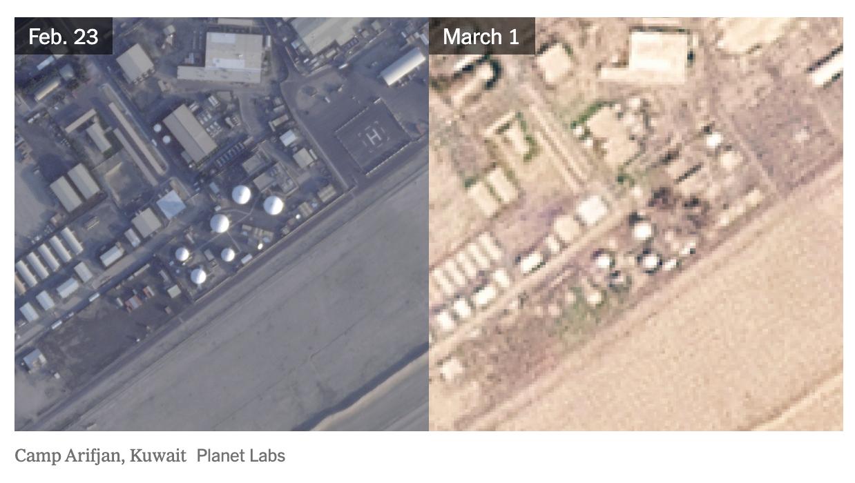 • В Кувейте - три радиолокационных купола на базе Кэмп-Арифджан были повреждены или разрушены; на авиабазе Али-эль-Салем были повреждены или разрушены по меньшей мере восемь зданий или сооружений, расположенных рядом с инфраструктурой спутниковой связи.